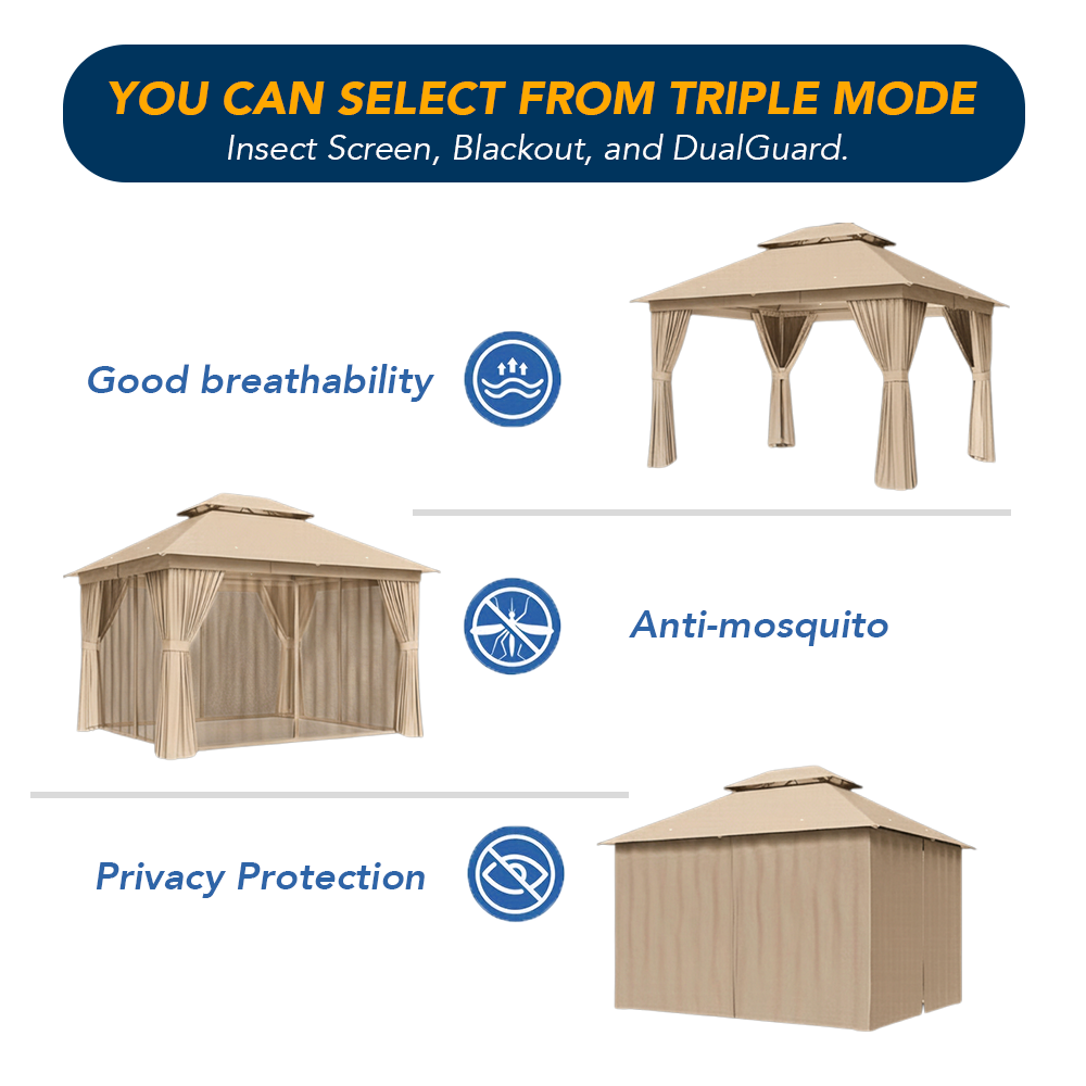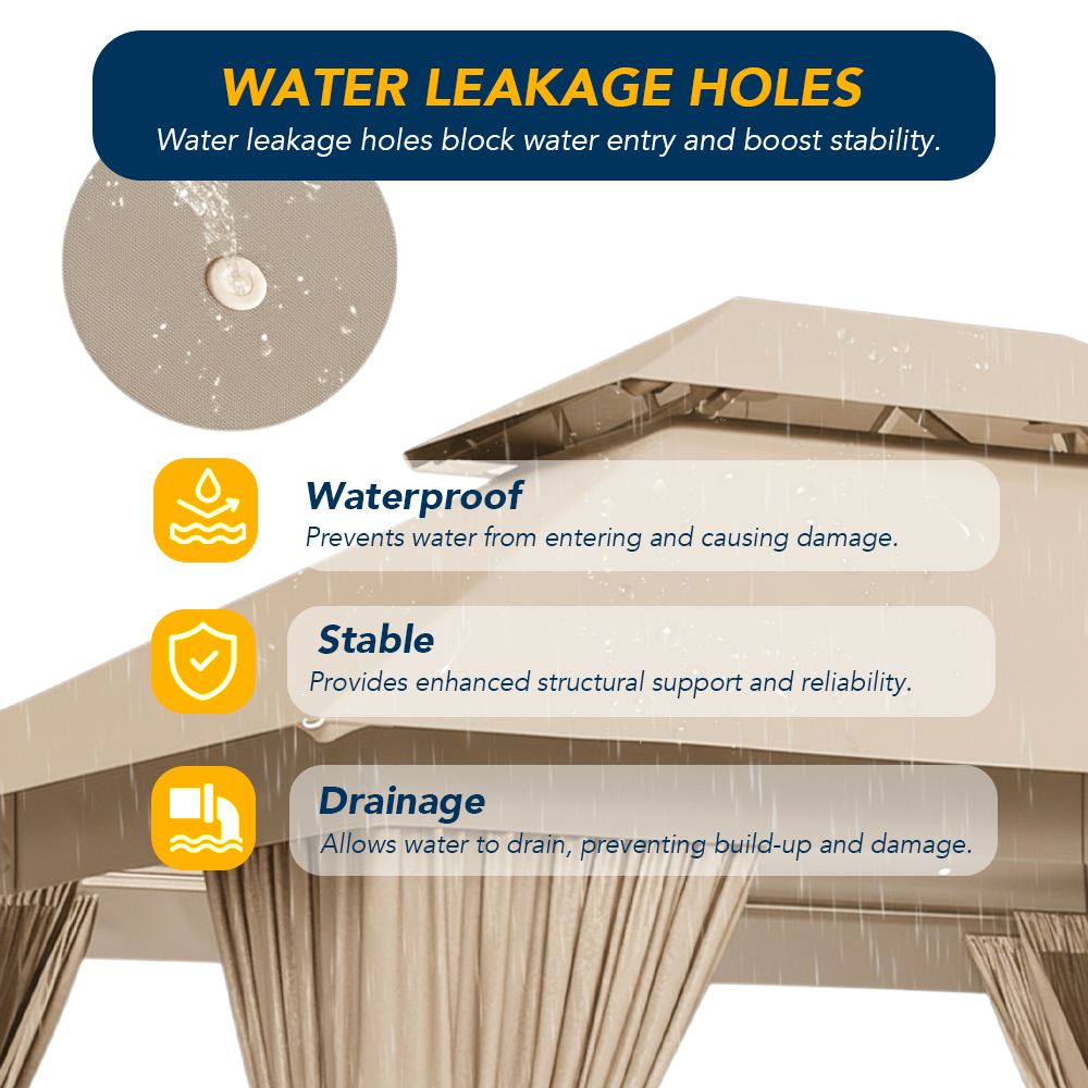 Equipped with mosquito nettings and waterproof curtains with zippers, this gazebo provides insect protection and privacy. Drainage holes on the roof help prevent water pooling, reducing pressure on the canopy and enhancing stability.