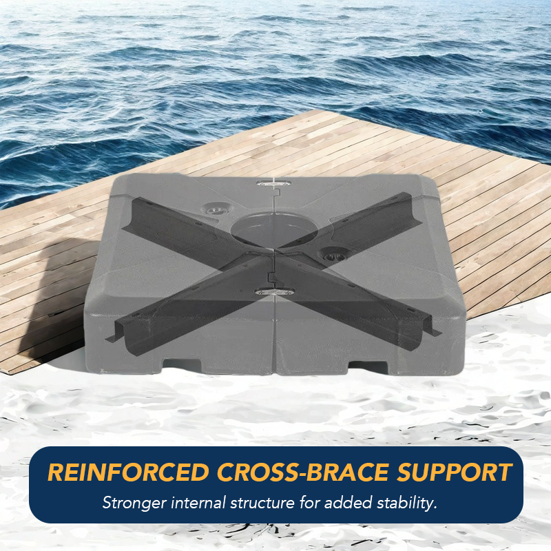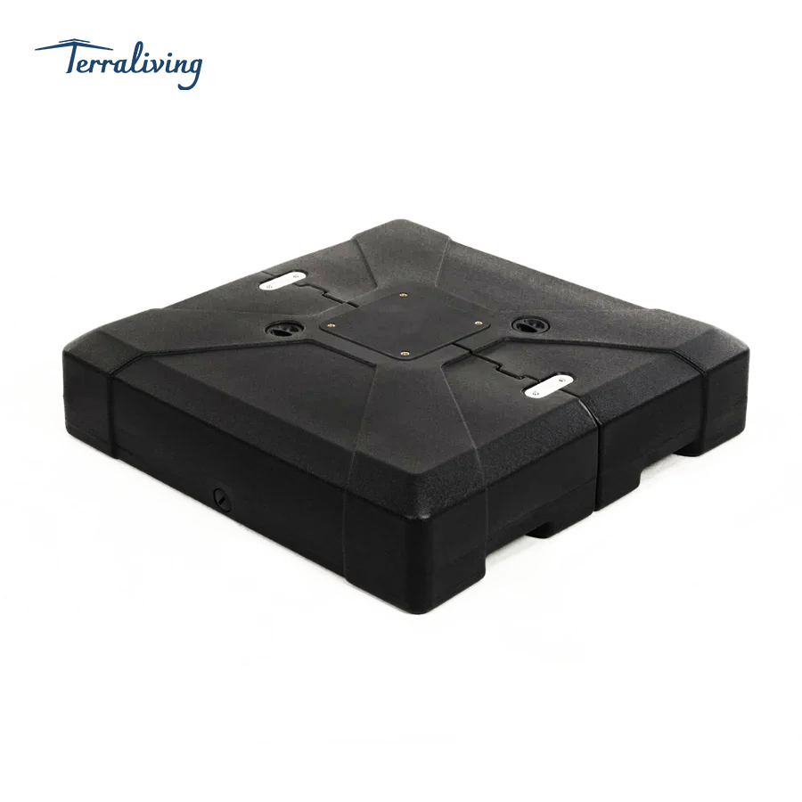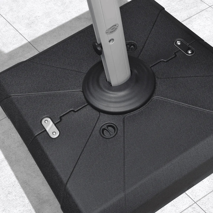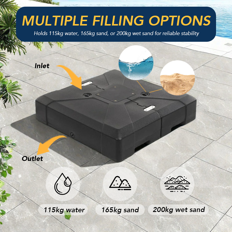 This refillable umbrella base features dual filling ports and supports three filling options: 115 kg of water, 165 kg of sand, or up to 200 kg of wet sand. The achievable weight provides strong stability to keep your cantilever umbrella secure in windy conditions. For best results, we recommend filling with sand first and then adding water. This method helps create a denser foundation, and if minor leakage occurs, the sand remains in place to maintain support.